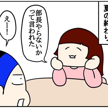 2025/12/12 どうなる?部長・委員長【前編】 このブログは、私くま子・旦那(タカシ)娘(マルコ/中学2年生)長男(イチオ/小学生)次男(ミツオ/3歳8ヶ月)の日常漫画です🏠夏の終わりに美術部部長になったマルコ。続きまして生徒会…!学生時代、生徒会にはご縁がなかった私からするとすごいなあーという想い。本人も先生か