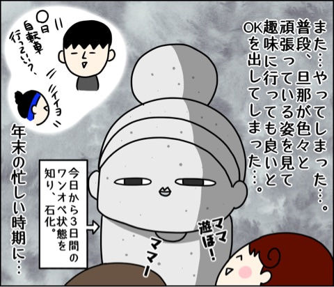 もう、ワンオペの気持ち、すごくわかります。うちの旦那は、独身時代から、正月1月1日は、お気に入りの趣味のショップの初売りに、朝から出かけてしまい、昼過ぎに帰ってくるのですが、子どもが生まれてからも変わりません。元旦は私の実家に挨拶に行くのですが、行くのは毎年夕方。もっと早く行けるはずなのに、旦那に合わせて、こうなります。子どもがいるのだから、もう少し、なんとかならないものかと思っています。