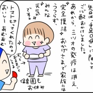 2024/07/02 週明けの様子と手足口病その後 このブログは、私くま子・旦那(タカシ)娘(マルコ/中学生)長男(イチオ/小学生)次男(ミツオ/2歳2ヶ月)の日常漫画です🏠先日は手足口病に関しましてご心配をおかけしました!お陰様で軽症ですみホッとしています😮💨まだまだ全国的に流行っていますので安心は出来ないですが