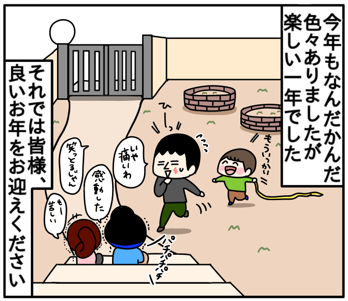 暮れの縄跳び 2019/12/30 カテゴリ:家族5人の話 ↓長縄の話も是非~♪↓ 今年もあと1日で終わりますね!今年も沢山笑った(´^ω^`)ブログ関係では本を出版したりブログを移転したりデザフェスに出てみたり、色々と経験した一年でした🙆♀️今年一年、ブログを見てくださりありがとうございました!🙇♀️次回は年始に更新しますね~😄それでは、良いお年を~\(^o^)/ 「家族5人の話」カテゴリの最新記事 < 前の記事次の記事 > コメント コメント一覧 (7) 7. うに 2019/12/31 15:34 今年も一年笑わせていただきました。 感動も、ほっこりネタもありがとうごさいました。 また来年も拝見し続けたいと思います。 よろしくお願いします🤗 0 kumahahamoyou がしました 6. モモ 2019/12/30 21:17 もう最高ですっ!! マルちゃんのギャハーが大好き!というかくま母さんの登場人物みんな大好きです♪ いつも笑いと感動をありがとうございます! 来年のご活躍も楽しみにしています! 0 kumahahamoyou がしました 5. すずmama 2019/12/30 19:59 今年はくま母さんのブログに出会えて、育児の孤独感がとっても軽くなりました(●´人`●)本当にありがとうございます♩ また来年もたくさんたくさん読みます♡ 0 kumahahamoyou がしました 4. そらりんば〜ば 2019/12/30 18:50 手加減無しの、容赦無しですよね〜笑 こうやって、書き留めておけると 見返す事が出来て良いですよね! お子達が大きくなって見てくれたら その時の苦労が報われる気がします。 これからも沢山、お腹がよじれる日常を 楽しみにしています! 0 kumahahamoyou がしました 3. カナピヨ 2019/12/30 18:32 いちおくん確かに可愛い❤️たかしさん痛そう💦ヤバイ・・・マルコちゃんぎゃはーって笑いすぎ・・・ 0 kumahahamoyou がしました 2. ラブ 2019/12/30 18:26 いつも、楽しく拝見させて頂いてます🎵 良いお年を♥ 0 kumahahamoyou がしました 1. みほ 2019/12/30 18:23 サイコー!! 前回の縄跳びのネタも大爆笑でお腹よじれ顔が痛いってくらい笑かしてもらいました!! マジで何回も見ました。 今回もいいですね。 これで年越されます。 来年もずっと見ます! 0 kumahahamoyou がしました コメントフォーム 名前 コメント 記事の評価 リセット リセット 顔 星 情報を記憶 コメントを投稿する