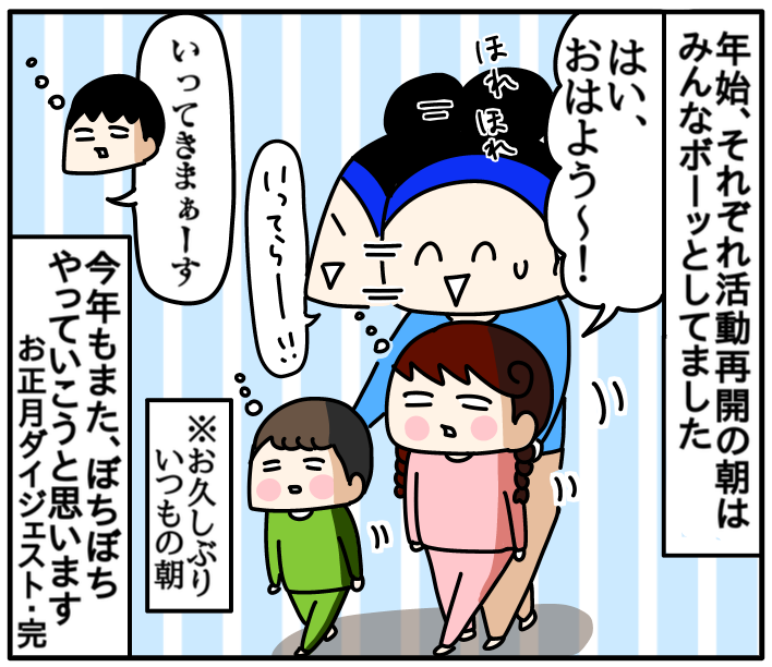 お正月ダイジェスト③ 2020/01/06 カテゴリ:家族5人の話 今日で完結です〜😄 以上、お正月ダイジェストでした~😊いやはや、正月明けはなかなか動けませんね!マルコだけは明日から学校なので今日は実家でしたがみんなボーっとしてました😂徐々にペースを取り戻していこう✊年末年始、皆様もお疲れさまでした☺️🙇♀️🧡↓去年の正月ボケの様子↓ ↓2年前はイライラしてたー!😂↓ 「家族5人の話」カテゴリの最新記事 < 前の記事次の記事 > コメント コメント一覧 (4) 4. くま母 2020/01/08 17:15 >>すずmamaさん 今は特にイライラすることはないですねーー。 モヤモヤしたらすぐ言って解消して…の繰り返しです。 でも生理前は気持ちも鬱々するし、正直しんどい時もあります:( ;´꒳`;):ただそれも、時間が経つと考え方もがらっと変わり、スッキリします。それでもモヤモヤが残った時はなるべく平和に旦那にも聞いてもらい解決、ですかねぇ…モヤモヤし続けるのはしんどいですよねぇ、、。早めに解決できますように…😖🙏 0 kumahahamoyou がしました 3. とちママ 2020/01/07 00:52 イチオどこ?がツボすぎて笑いすぎてやばいです(笑) 0 kumahahamoyou がしました 2. あじどうらく 2020/01/07 00:26 これはイチオくんのコントローラー繋がってないやつですか😂?末っ子あるある笑 0 kumahahamoyou がしました 1. すずmama 2020/01/06 23:10 くま母さんは、最近は子育てや旦那さんのことでもやもやすることはありますか?たかしさんパパレベル高すぎて羨ましすぎます…(●´人`●) 産後、生理前ってなーんかメソメソしたりモヤモヤしたりしてだめですー自己嫌悪です( ˊ࿁ˋ ) ᐝ 0 kumahahamoyou がしました コメントフォーム 名前 コメント 記事の評価 リセット リセット 顔 星 情報を記憶 コメントを投稿する