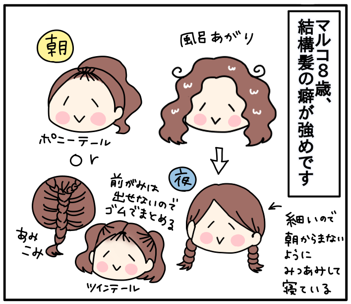 小さい頃は毛先がくるりんとしてて、本人もお気に入りだったのですが、小学生になって、根元からちりちりな感じが強くなり…