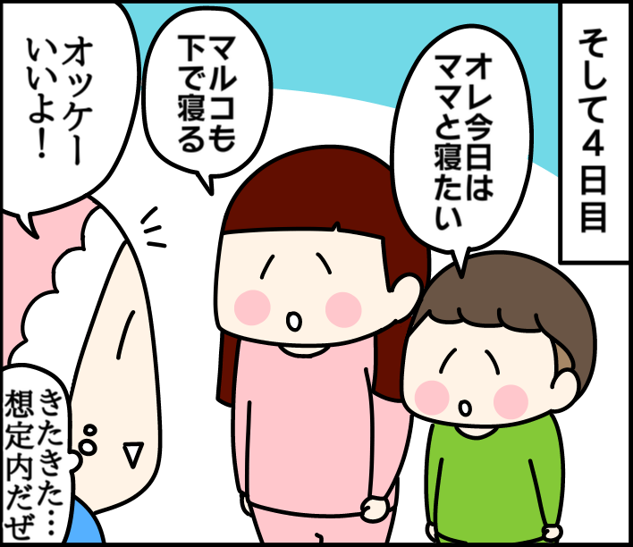 結局どうなったのか気になります。上段は使わずに4人で下に寝るのかな?笑