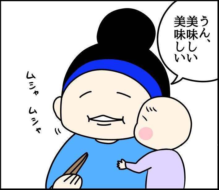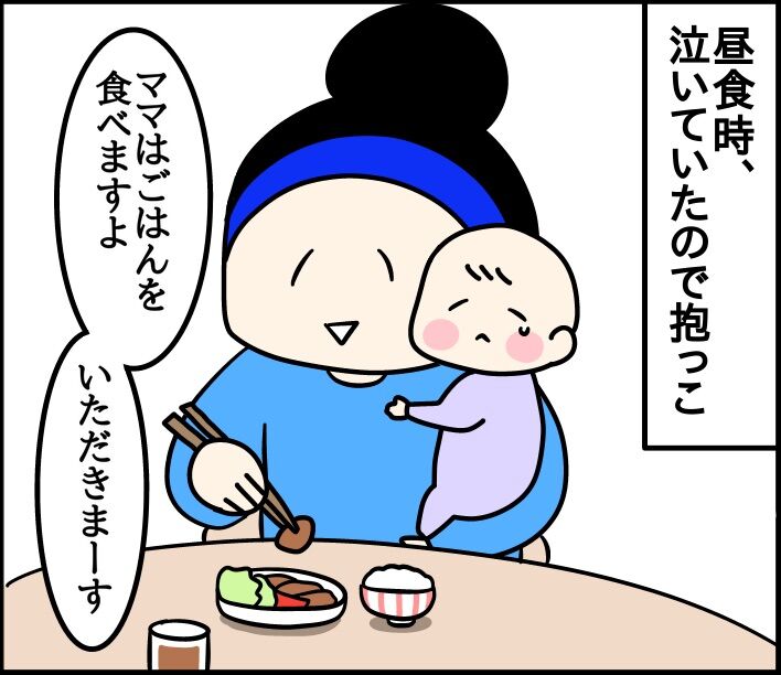 娘を抱っこしながら食事して、何度娘の頭に汁やらご飯粒やら落としたことか。笑