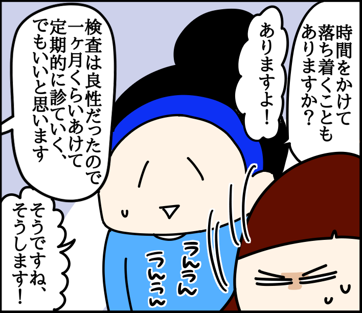 経過観察になって間もなく、しこりは小さくなり今では完全に無くなりました。