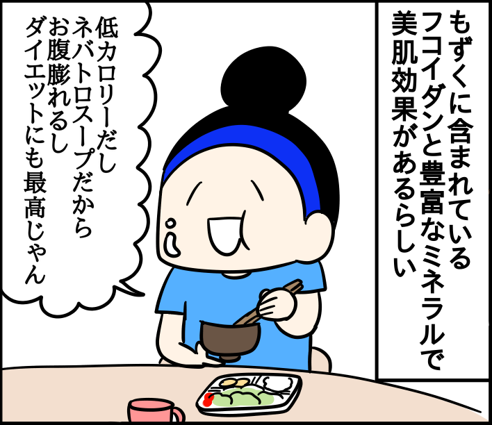 ちなみにちなみに、もずくの栄養素は塩漬けされると抜けやすくなるので、塩漬けや味付けをされていない物を選ぶのがベストだそうです。