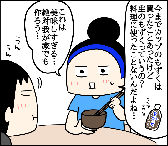 生もずくはよく買うんですが、いつもポン酢を薄めてちょっと甘くしたやつ和えて食べてました。