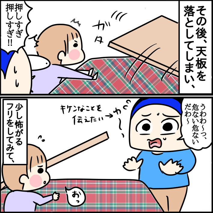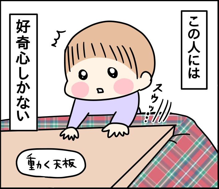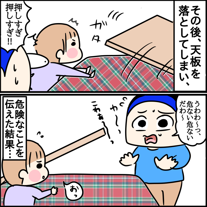 うちも天板動くのが面白いらしくて、ズラしては、ズラしたこたつ布団と天板の間に手を入れたり、おもちゃ入れたりしてます😂さすがに天板が落ちるほど動かない(片側壁につけてるから)からか、入ることはなかったです😂