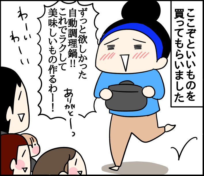 プレゼントが自分用ではなく、家族の事も考えての調理器具という所にくま母さんの色んな優しさを感じました!