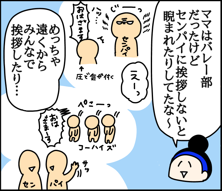 最初に入部した部活はTHE体育会系で先輩を見かけた時は、すれ違うまでに何度か挨拶をしないといけないという謎ルールがありました💦(後輩は挨拶しないといけないのに、先輩は超そっけなかった…笑)