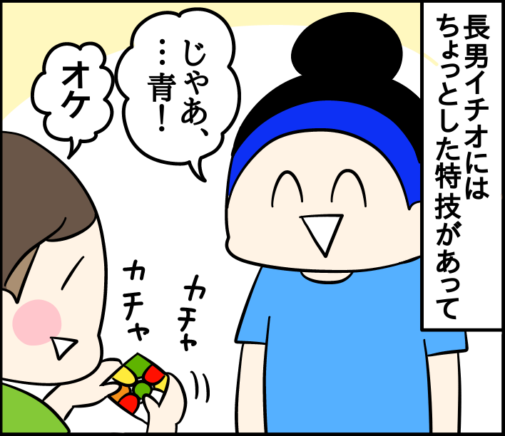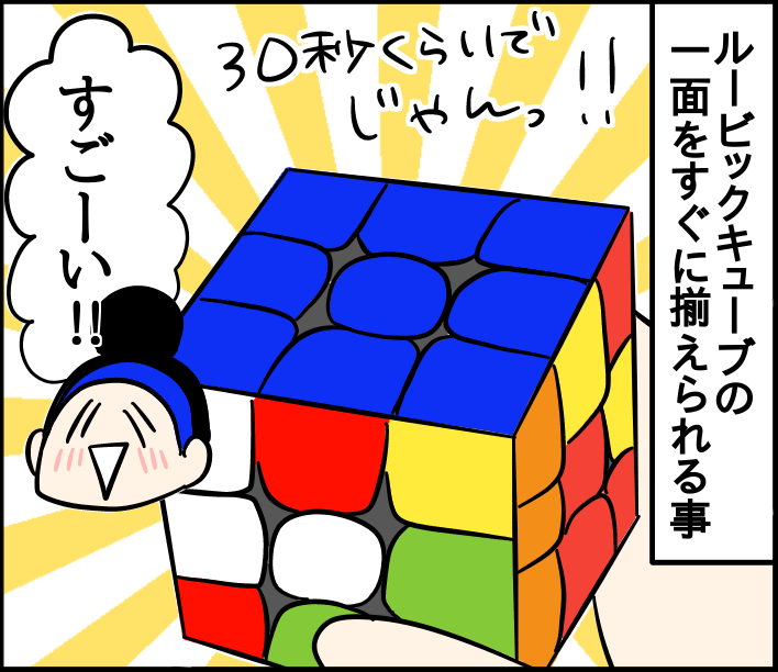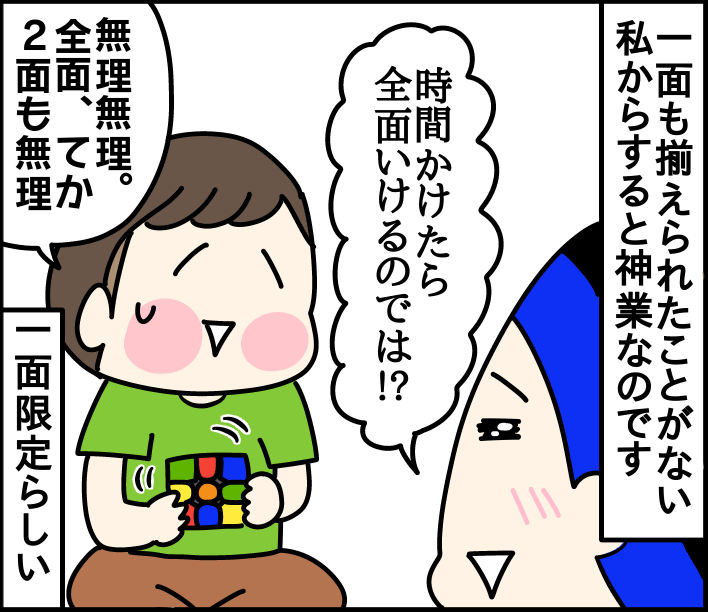 ルービックキューブの一面を操る男 2025/07/15 カテゴリ:イチオ小学生 このブログは、私くま子・旦那(タカシ)娘(マルコ/中学生)長男(イチオ/小学生)次男(ミツオ/3歳3ヶ月)の日常漫画です🏠ルービックキューブの一面をカチャカチャカチャーッとすぐに揃えてくれるイチオ氏。ルービックキューブ揃えられなさすぎて意味がわからない私からすると本当に神業で😳👏時間かけたら2面でも3面でもできそうだけどそれは無理らしいです☺️いつか見てみたいな~👀✨️ 「イチオ小学生」カテゴリの最新記事 < 前の記事次の記事 > コメント コメント一覧 (4) 4. コパンダ 2025/07/30 12:57 うちの息子もYouTube見て全面揃えれるようになりました。 私は同じYouTube見ても揃えれませんでした(笑) 0 kumahahamoyou がしました 3. メロンパン 2025/07/16 20:09 同じルービックキューブ持ってます!! 0 kumahahamoyou がしました 2. うに。 2025/07/16 00:26 お花とか出来るイチオ君凄い!!! 2面揃えるのってなかなかできない、、、 あとちょっとができない気持ちになります。 0 kumahahamoyou がしました 1. 名無しの権兵衛 2025/07/15 20:59 一面だけでも十分凄いッス!羨ましい!👍👍 0 kumahahamoyou がしました コメントフォーム 名前 コメント 記事の評価 リセット リセット 顔 星 情報を記憶 コメントを投稿する