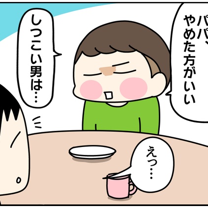 2025/05/01 しつこい男 このブログは、私くま子・旦那(タカシ)娘(マルコ/中学生)長男(イチオ/小学生)次男(ミツオ/3歳)の日常漫画です🏠定期的に娘をイラつかせる旦那と パパの痛いところをすかさず突いていく長男www強すぎて笑った🤣余談ですが久しぶりにピザ食べて幸せだったあ~🤤美味しかった