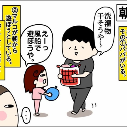 2018/09/17 我が家の祝日の朝にありがちな光景 このブログは家族の日常を絵日記にしています。 初めましての方は…↓ブログ紹介ページへ☆ ****************マルコ6歳**イチオ3歳0ヶ月*祝日は大体こんな感じで。特に月曜日は。旦那曰く雰囲気で休みとわかってたイチオ。なのに私が一人テンパって保育